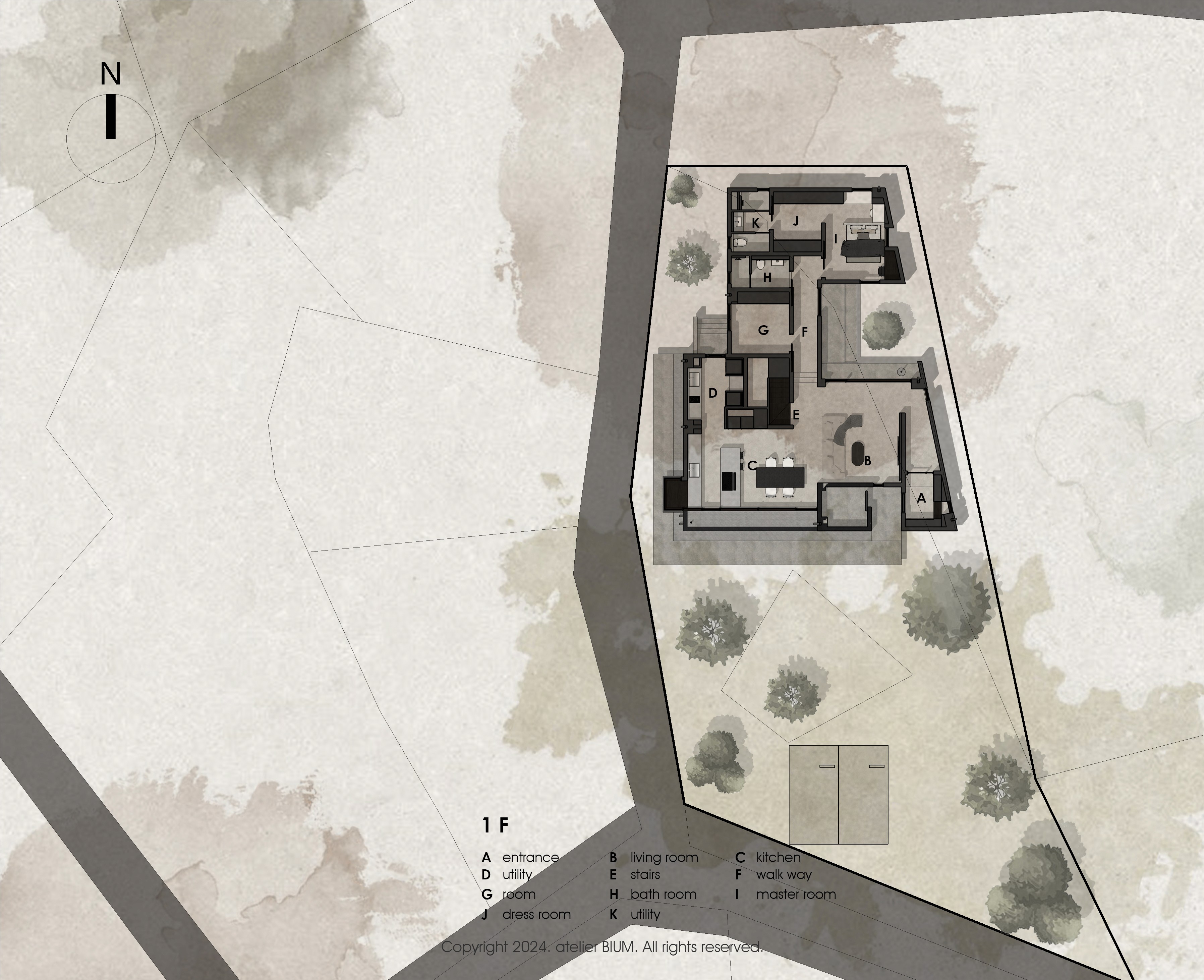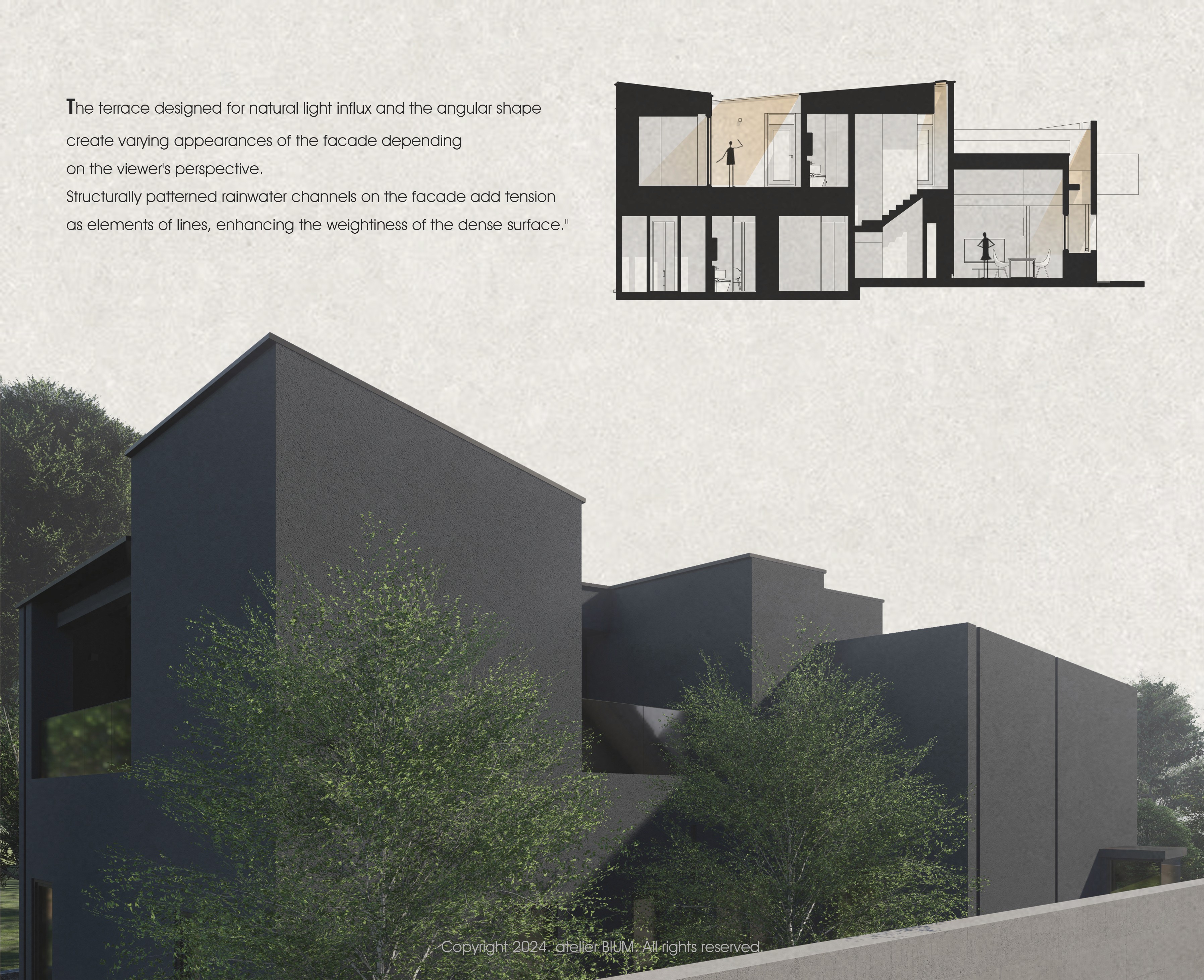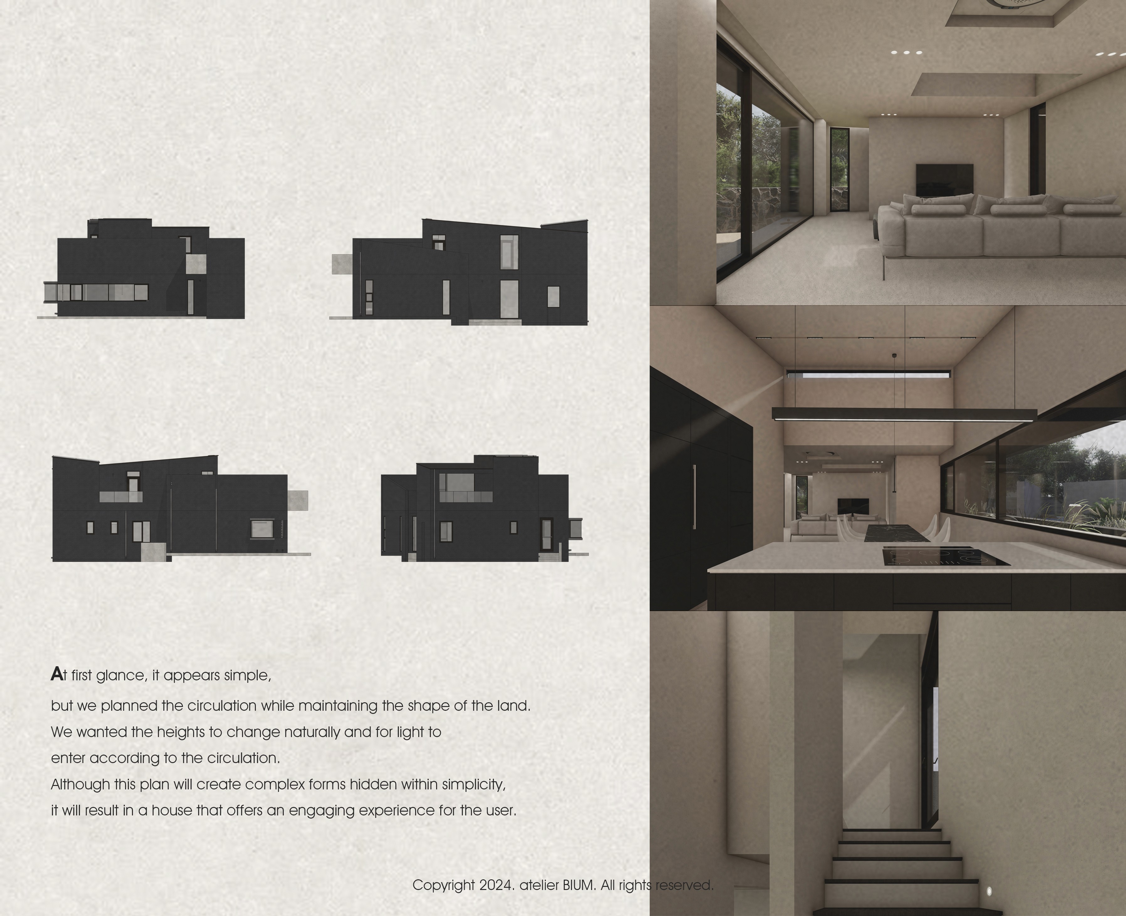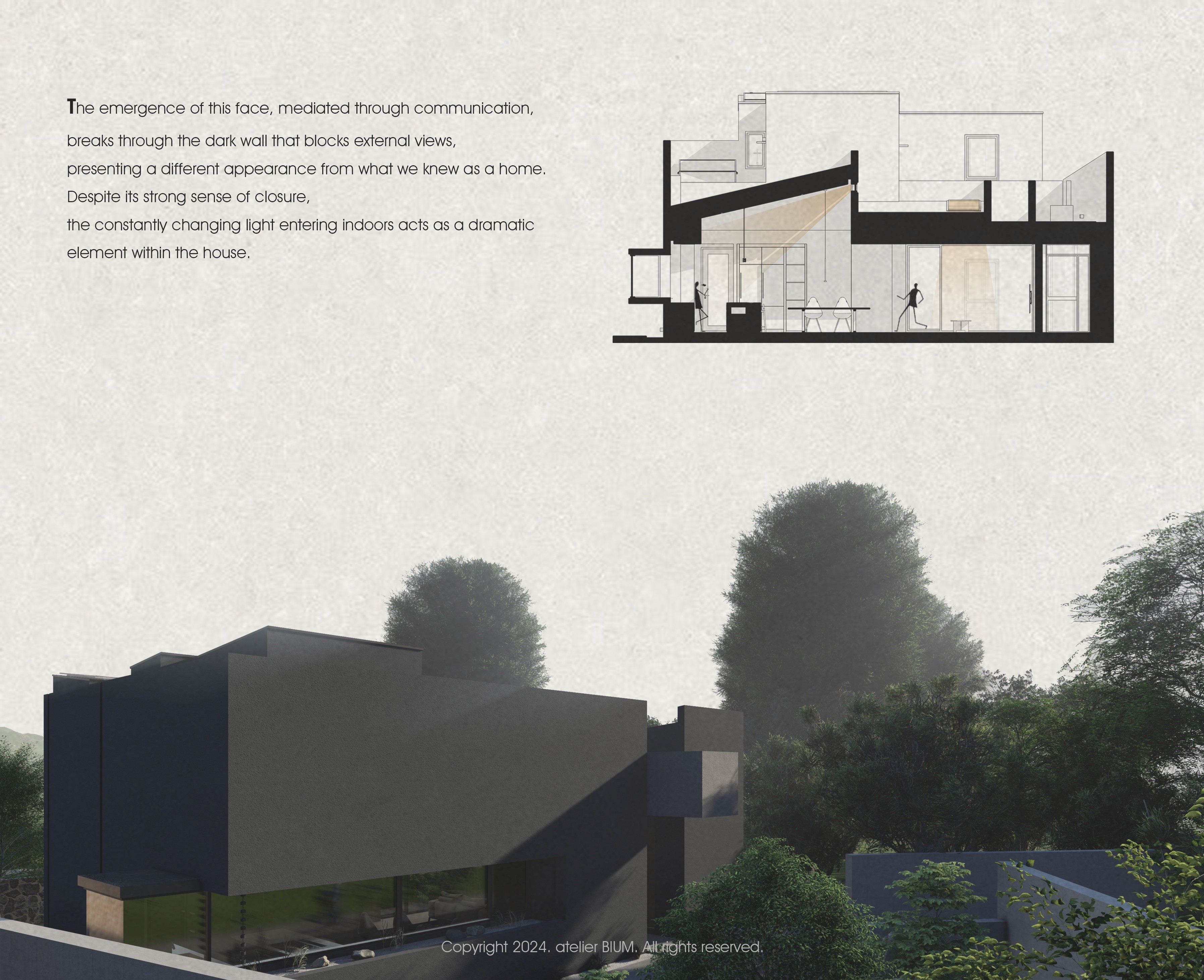 '짙은 삶의 흔적을 기리며' 삶은 짙은 어둠이 내려앉은 망망대해를 건너는 과정과 같다. 달빛에 일렁이는 깊은 청록의 바다를 헤쳐 나아가는 여정 속에서도, 우리는 서로를 믿고 의지할 수 있는 가족이라는 등불을 가진다. 험난한 시간을 지나 평온한 황혼을 꿈꾸는 부모는 일상에 지친 자녀들에게 등불이자 안식처가 되고자 이 집을 짓는다. 우리는 서로 다른 물질의 비율과 온도에 따라 색과 광택이 달라지는 칠보 공예, 그리고 시간을 두고 덧입혀 깊이를 만들어내는 옻칠의 방식에서 인생을 닮은 물성과 시간의 가치를 읽어냈다. 특별한 기교 대신, 재료 본연의 성질을 조합해 만들어낸 짙고 깊은 청록의 집. 단순한 입면 속에 숨겨진 복합적인 천장 구조는 시간의 흐름에 따라 빛을 부드럽게 분산시키며, 집 안 곳곳에 은은한 밝기를 쌓아간다. 소박하지만 넉넉하게 베풀며 살아온 건축주 부부의 삶은 이 집 안에서 물성과 빛, 그리고 시간의 층위로 다시 드러난다. designed by BI:UM constructed by BI:UM furniture & lighting : ateler bium, demark