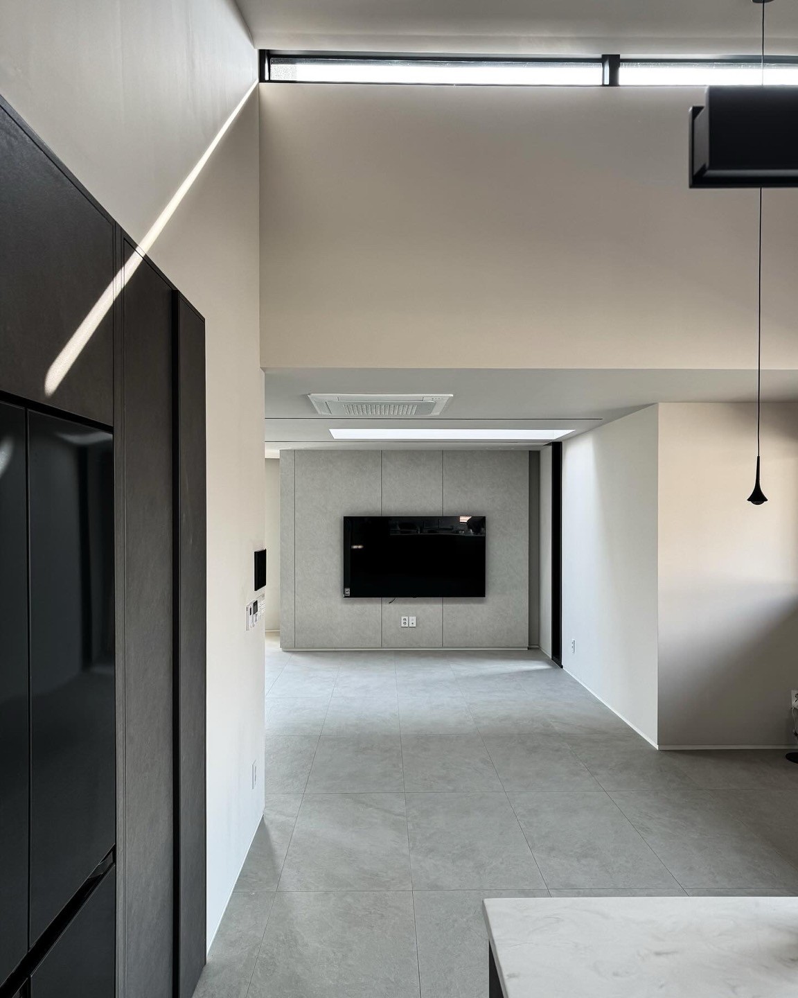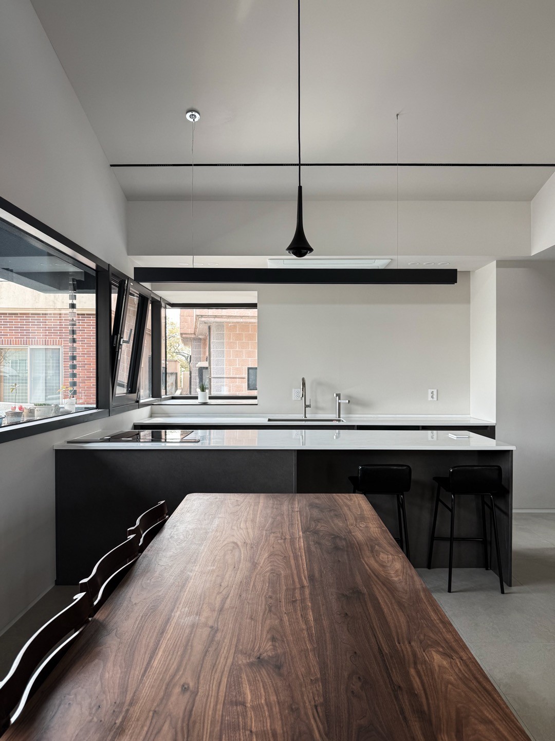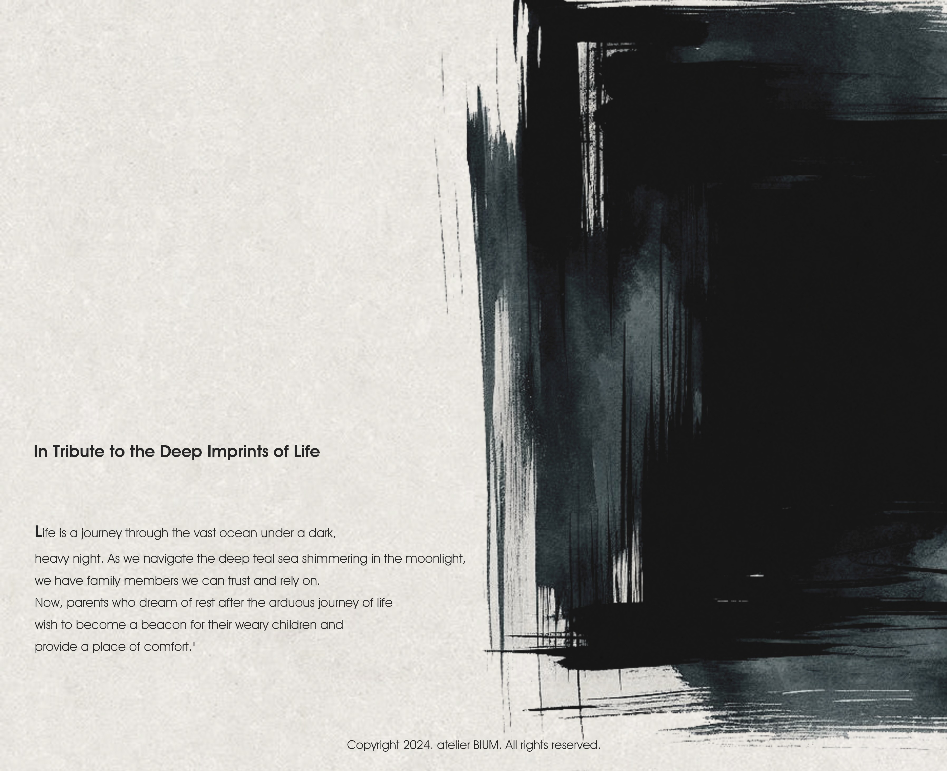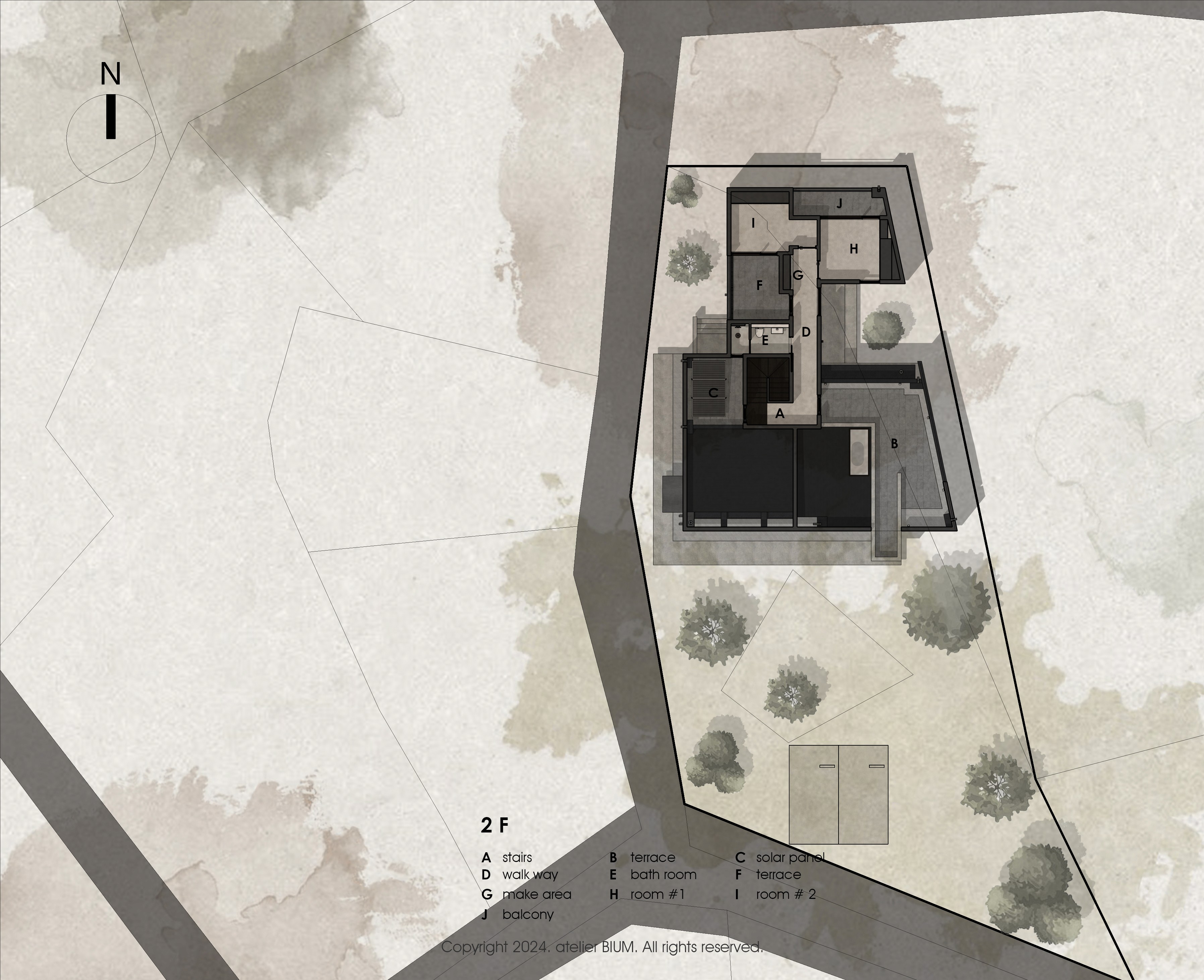 '짙은 삶의 흔적을 기리며' 삶은 짙은 어둠이 내려앉은 망망대해를 건너는 과정과 같다. 달빛에 일렁이는 깊은 청록의 바다를 헤쳐 나아가는 여정 속에서도, 우리는 서로를 믿고 의지할 수 있는 가족이라는 등불을 가진다. 험난한 시간을 지나 평온한 황혼을 꿈꾸는 부모는 일상에 지친 자녀들에게 등불이자 안식처가 되고자 이 집을 짓는다. 우리는 서로 다른 물질의 비율과 온도에 따라 색과 광택이 달라지는 칠보 공예, 그리고 시간을 두고 덧입혀 깊이를 만들어내는 옻칠의 방식에서 인생을 닮은 물성과 시간의 가치를 읽어냈다. 특별한 기교 대신, 재료 본연의 성질을 조합해 만들어낸 짙고 깊은 청록의 집. 단순한 입면 속에 숨겨진 복합적인 천장 구조는 시간의 흐름에 따라 빛을 부드럽게 분산시키며, 집 안 곳곳에 은은한 밝기를 쌓아간다. 소박하지만 넉넉하게 베풀며 살아온 건축주 부부의 삶은 이 집 안에서 물성과 빛, 그리고 시간의 층위로 다시 드러난다. designed by BI:UM constructed by BI:UM furniture & lighting : ateler bium, demark