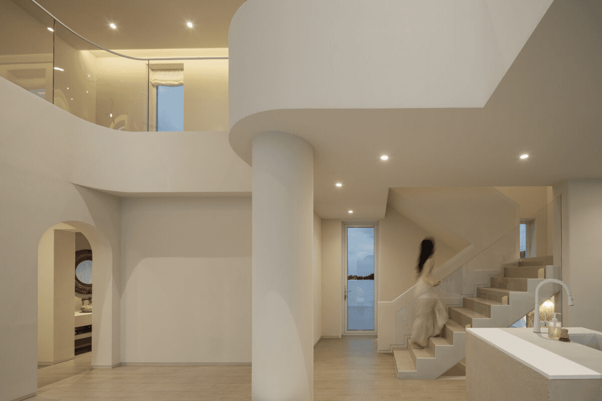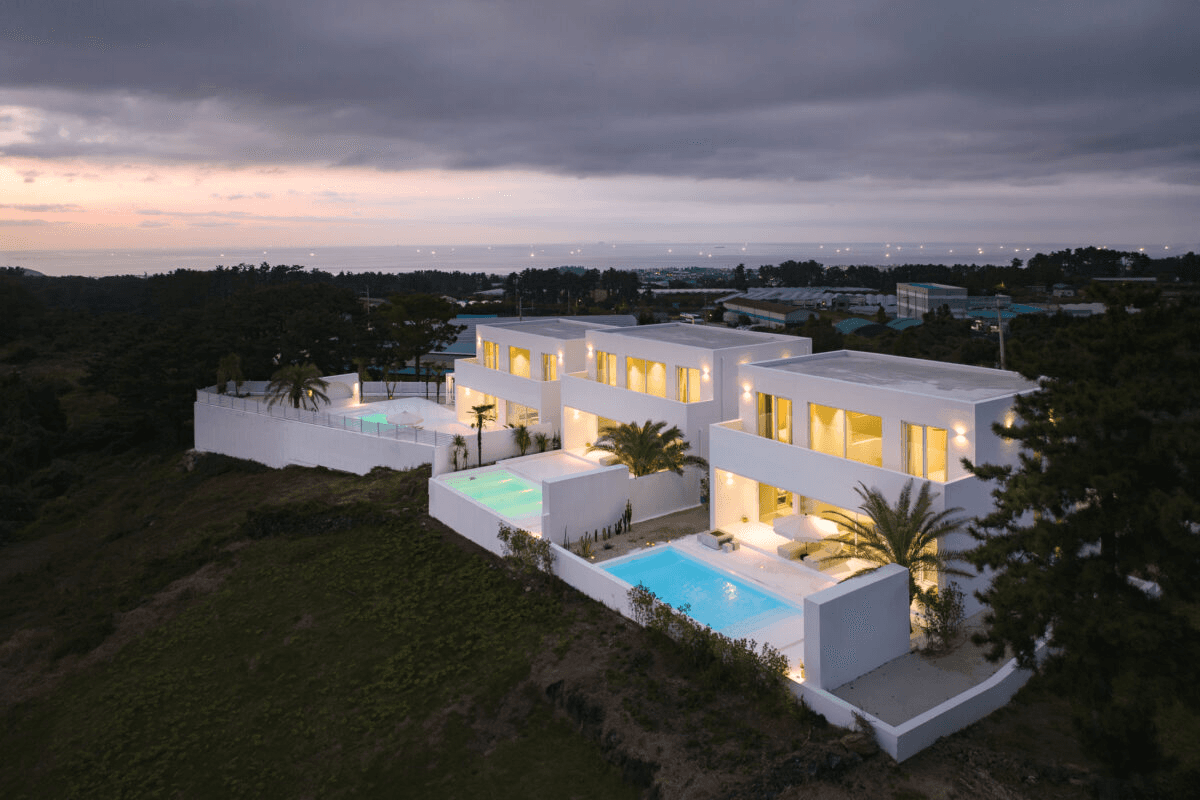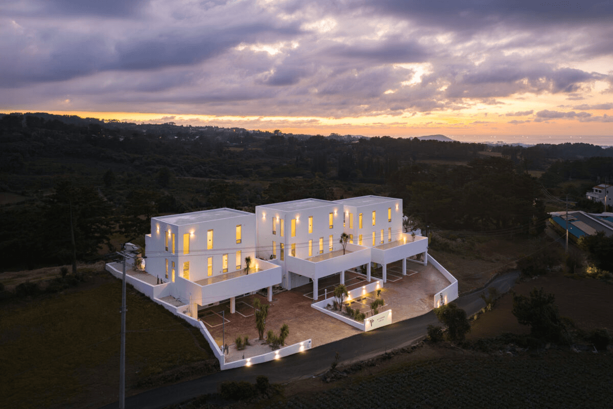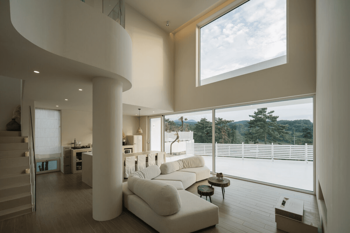 ‘빛이 흐르는 유려한 도자기 같은 공간’ 산과 숲, 그리고 바다를 품은 애월의 자연을 느끼며 온전한 나를 찾는 장소. 단순하지만 직관적인 덩어리 내부로 비치는 빛은 유려한 선을 따라 공간 전체에 흐르며 굴곡을 극대화 시킨다. 제주스러운 풍경 위에 이국적인 감성을 느낄 수 있는 이 공간은 순백의 모래사장을 걷는 듯 외부에서 내부로 자연스럽게 흘러 들어오면 모난 부분 없는 해변의 조약돌을 연상 시키는 곡면의 공간이 펼쳐진다. Directed by B I : U M Architectural designed by 가람영산 건축사 사무소 Space designed by B I : U M Photograph by haneol pics.