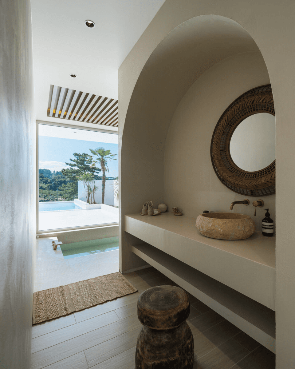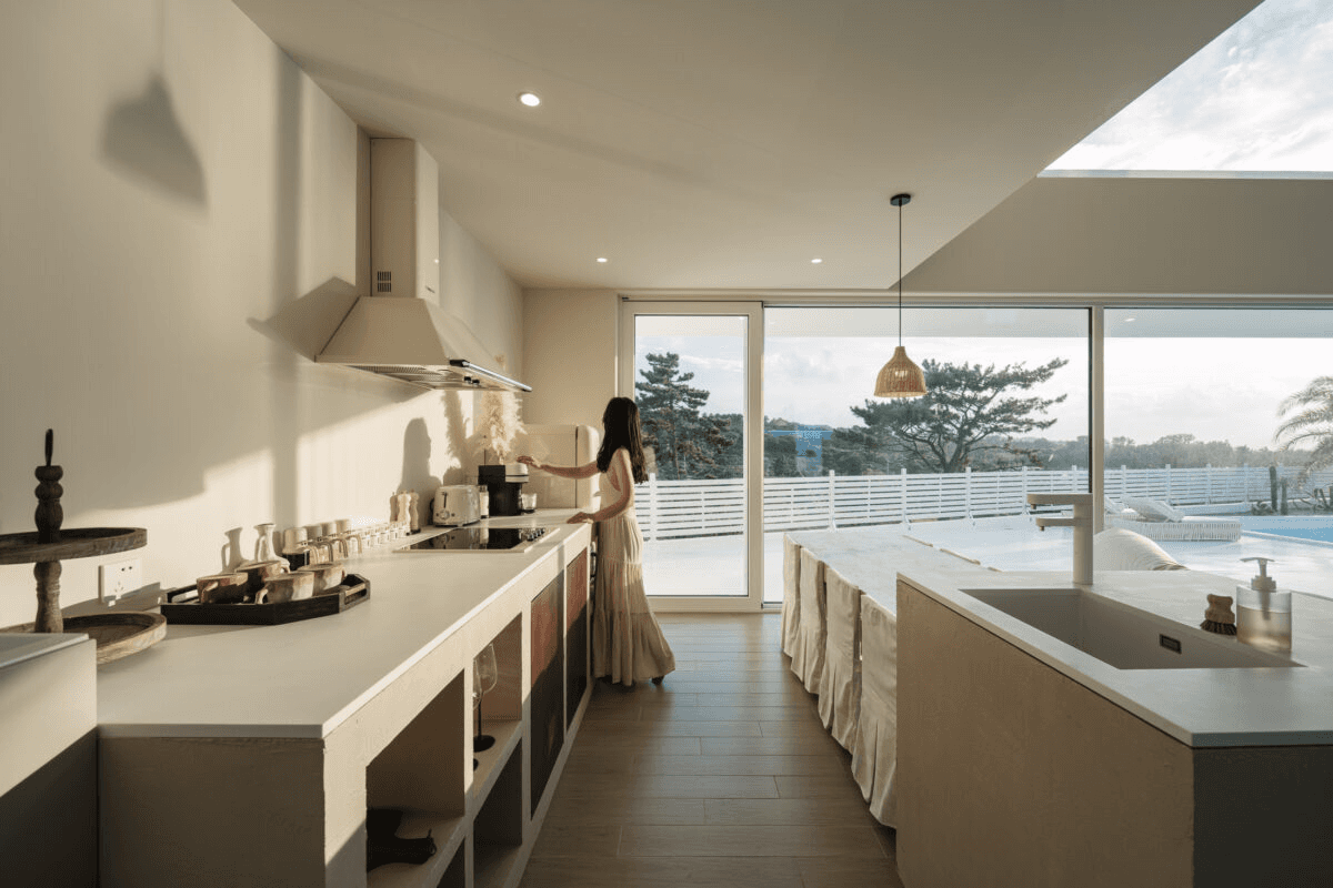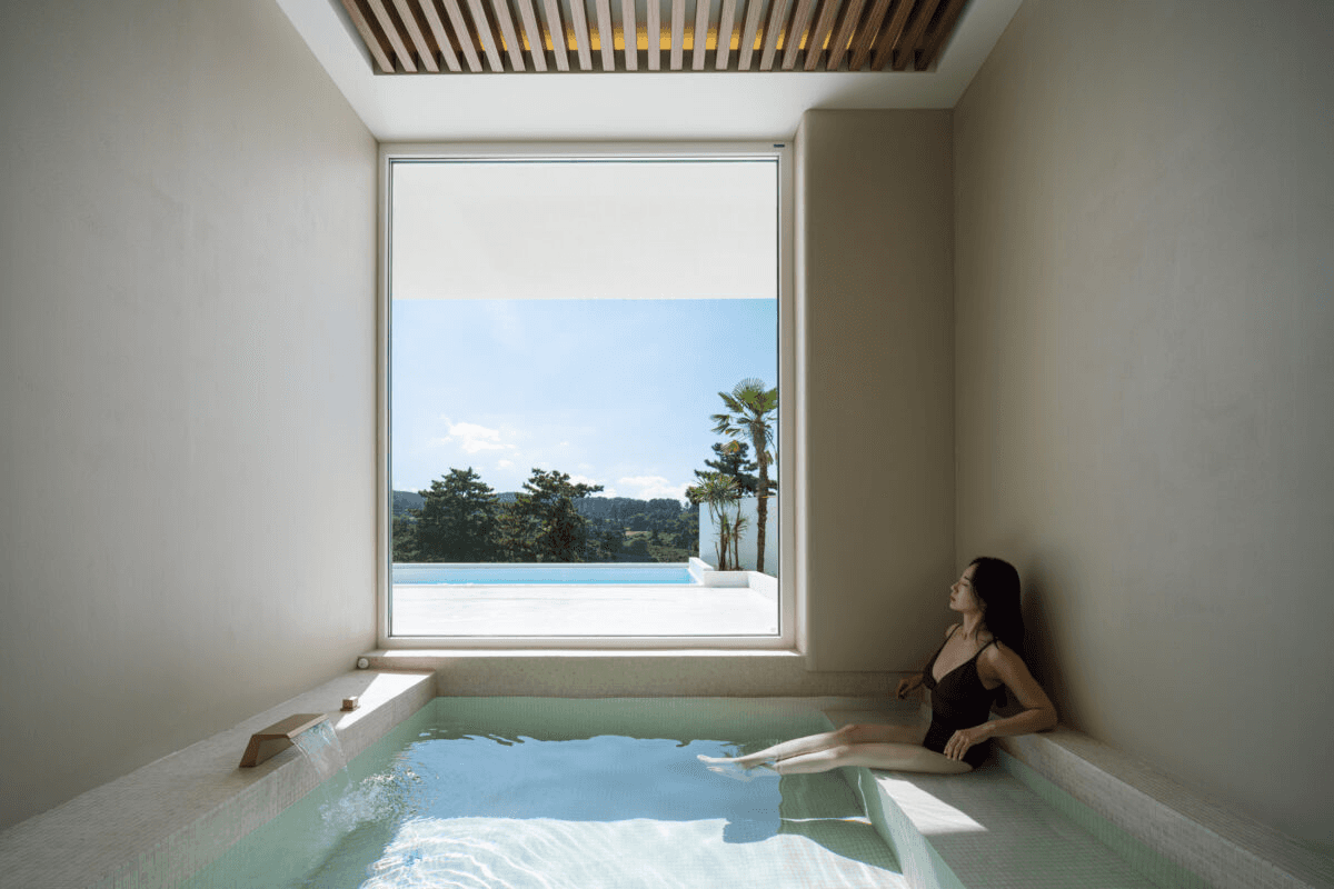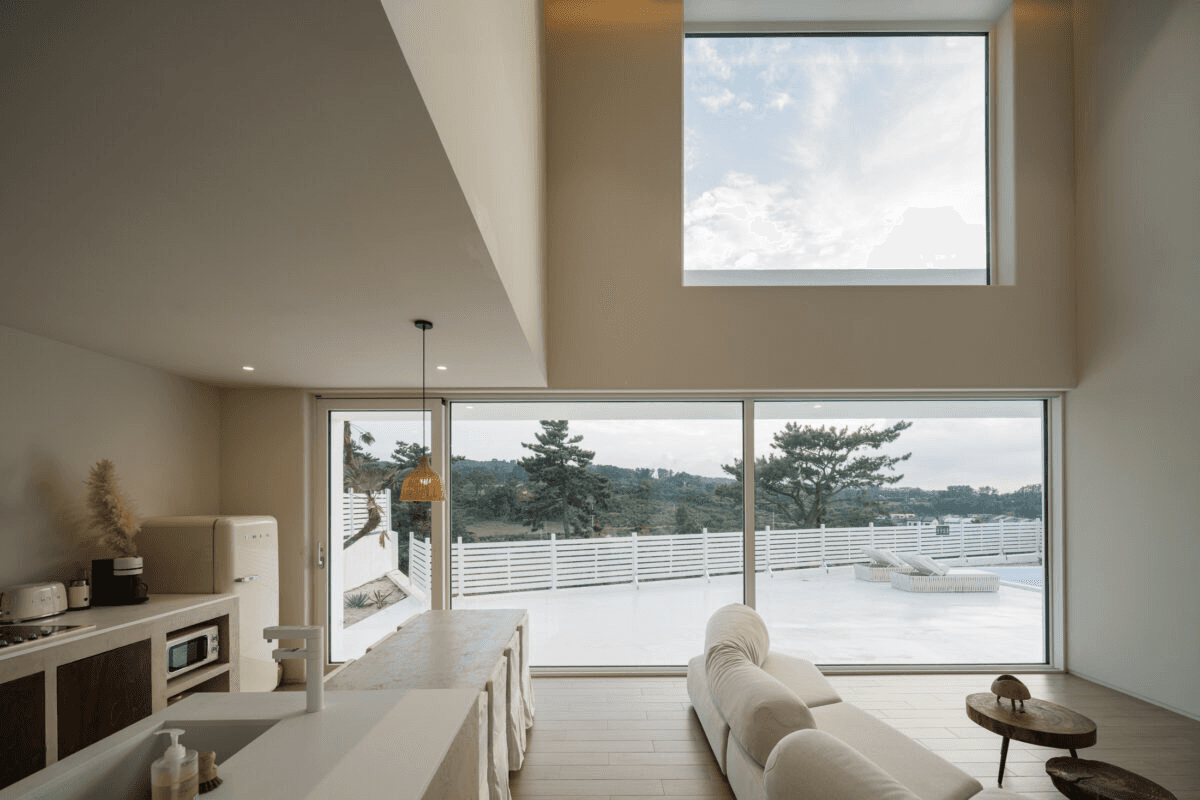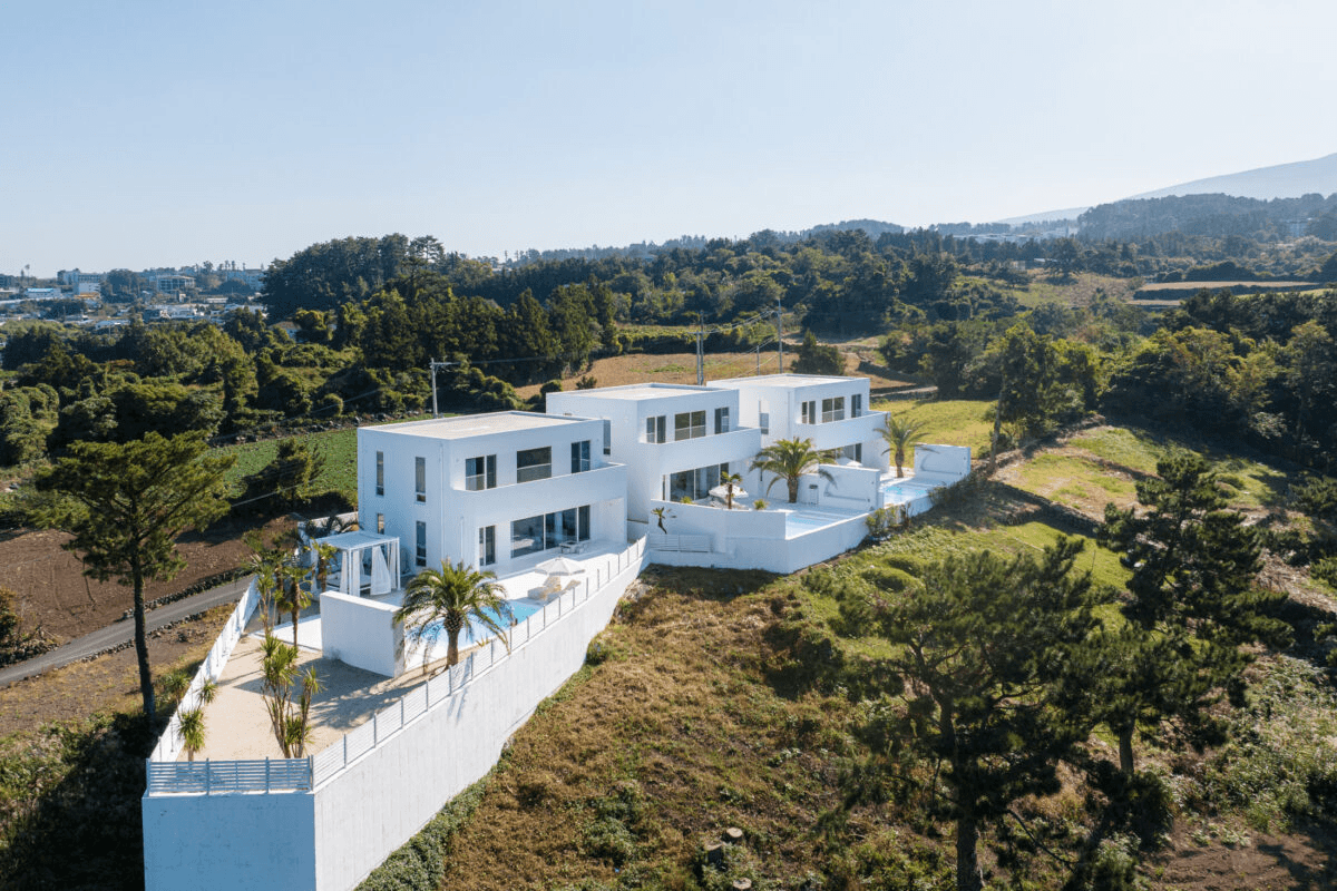‘빛이 흐르는 유려한 도자기 같은 공간’ 산과 숲, 그리고 바다를 품은 애월의 자연을 느끼며 온전한 나를 찾는 장소. 단순하지만 직관적인 덩어리 내부로 비치는 빛은 유려한 선을 따라 공간 전체에 흐르며 굴곡을 극대화 시킨다. 제주스러운 풍경 위에 이국적인 감성을 느낄 수 있는 이 공간은 순백의 모래사장을 걷는 듯 외부에서 내부로 자연스럽게 흘러 들어오면 모난 부분 없는 해변의 조약돌을 연상 시키는 곡면의 공간이 펼쳐진다. Directed by B I : U M Architectural designed by 가람영산 건축사 사무소 Space designed by B I : U M Photograph by haneol pics.