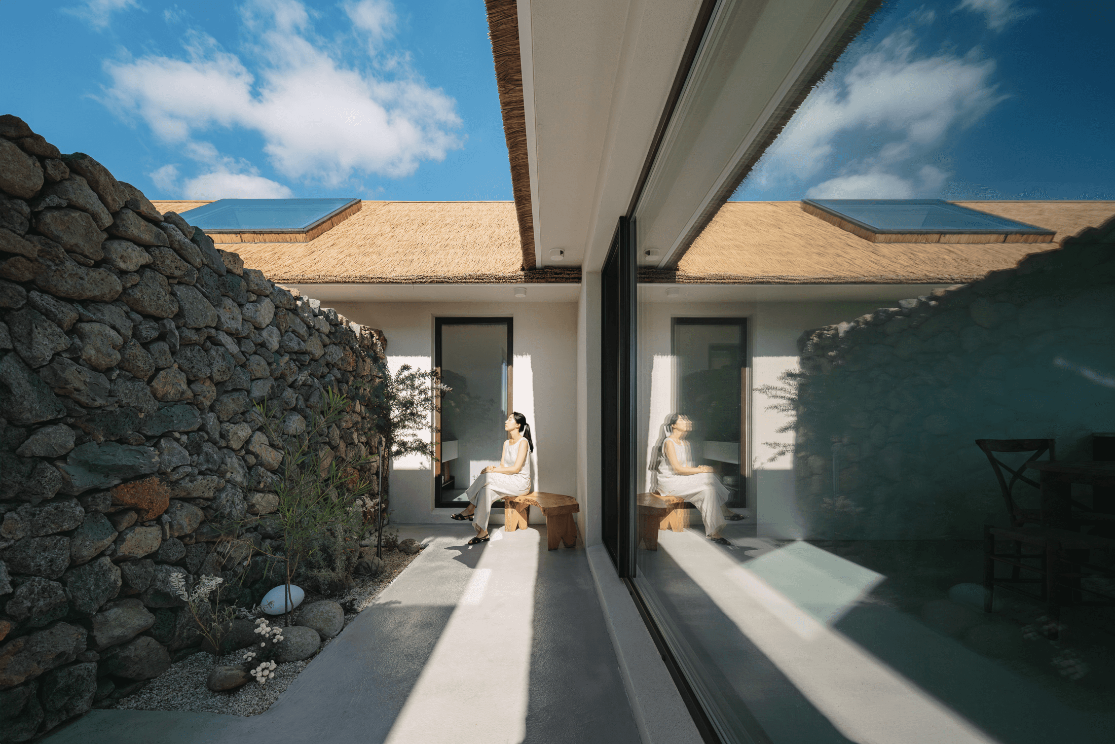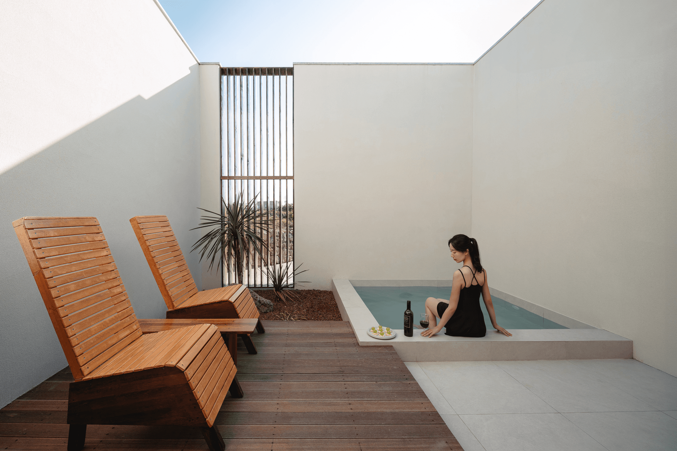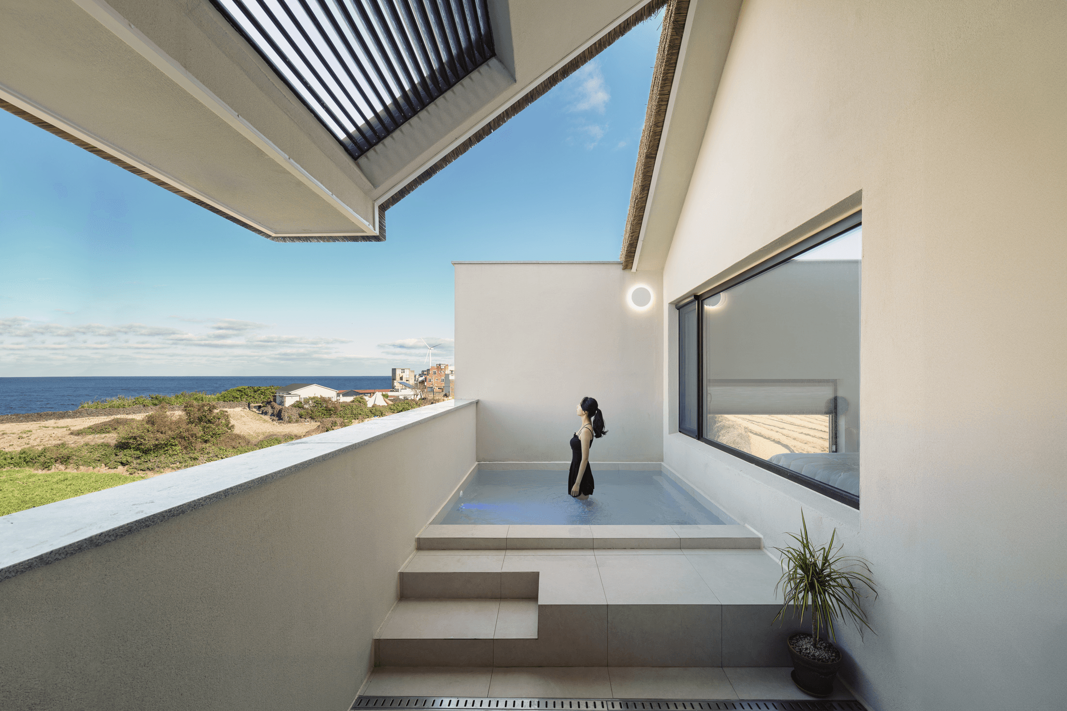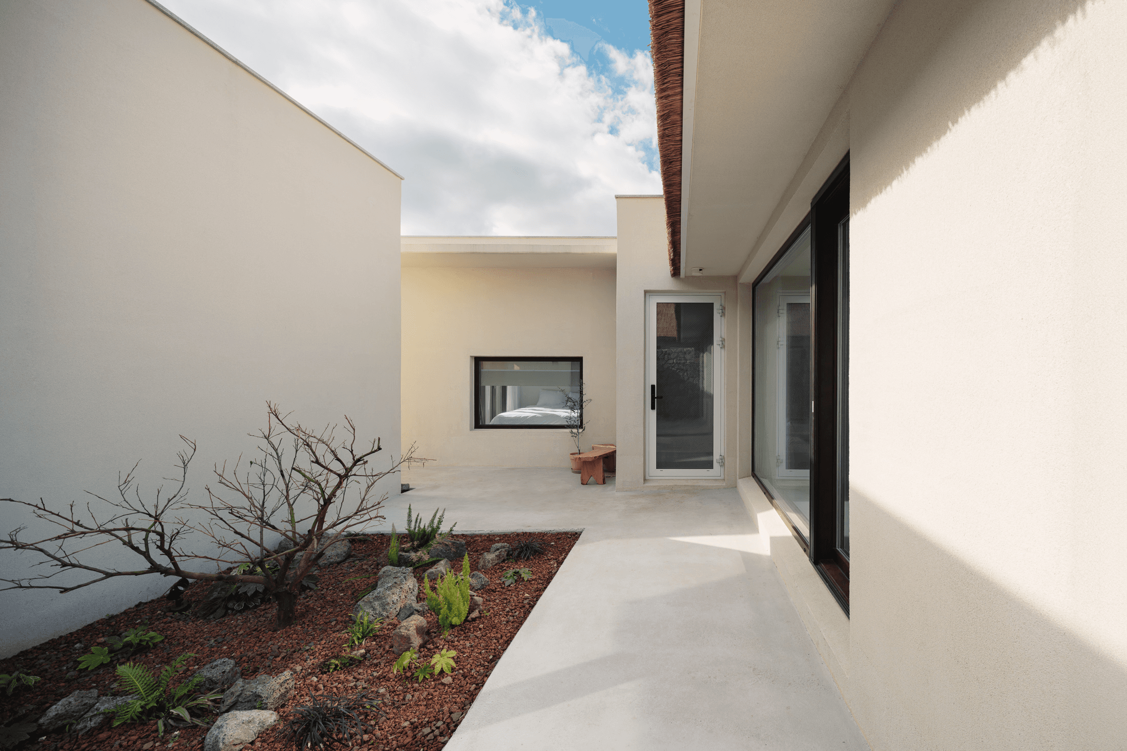 ‘속삭임의 순간’ 공간의 배치에 의해 자연스럽게 형성되는 자그마한 골목. 오묘한 정취와 제주의 푸른 바다. 그 속에서 우리는 사랑을 속삭이고, 휴식을 취하며, 낭만을 즐긴다. 아늑함 속에서 정신을 수양하고 땀을 흘리는 체험이 공존하는 또 다른 작은 세계를 만든다. 멀다면 멀고 가깝다면 가까운 그 몇 걸음 속에서 우리는 공간을 느끼고, 자연을 느낀다. 공간을 따라 발견하는 소소한 즐거움은 작은 공간이 커 보이는 역할을 한다. 공간과 공간 사이의 빈 공간이 만들어 내는 아늑함 속에서 각자 속삭임의 순간을 즐기는 하나의 작은 세상을 만들고자 한다. designed by B I : U M constructed by Y&K design photograph by haneol pics