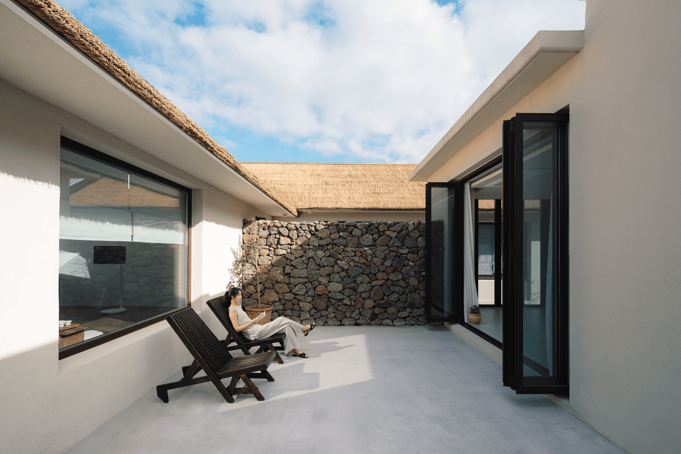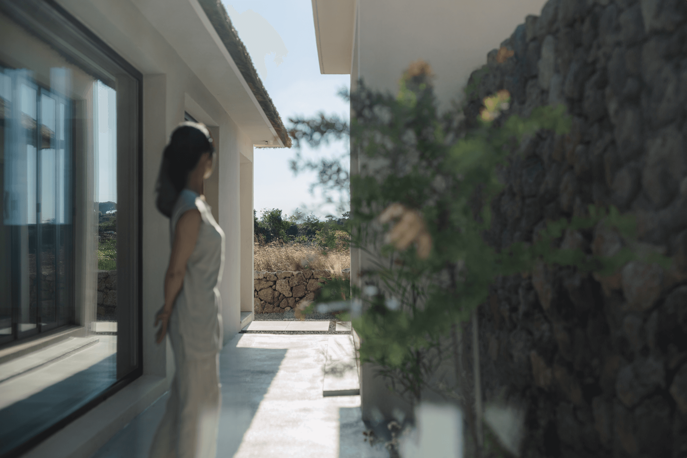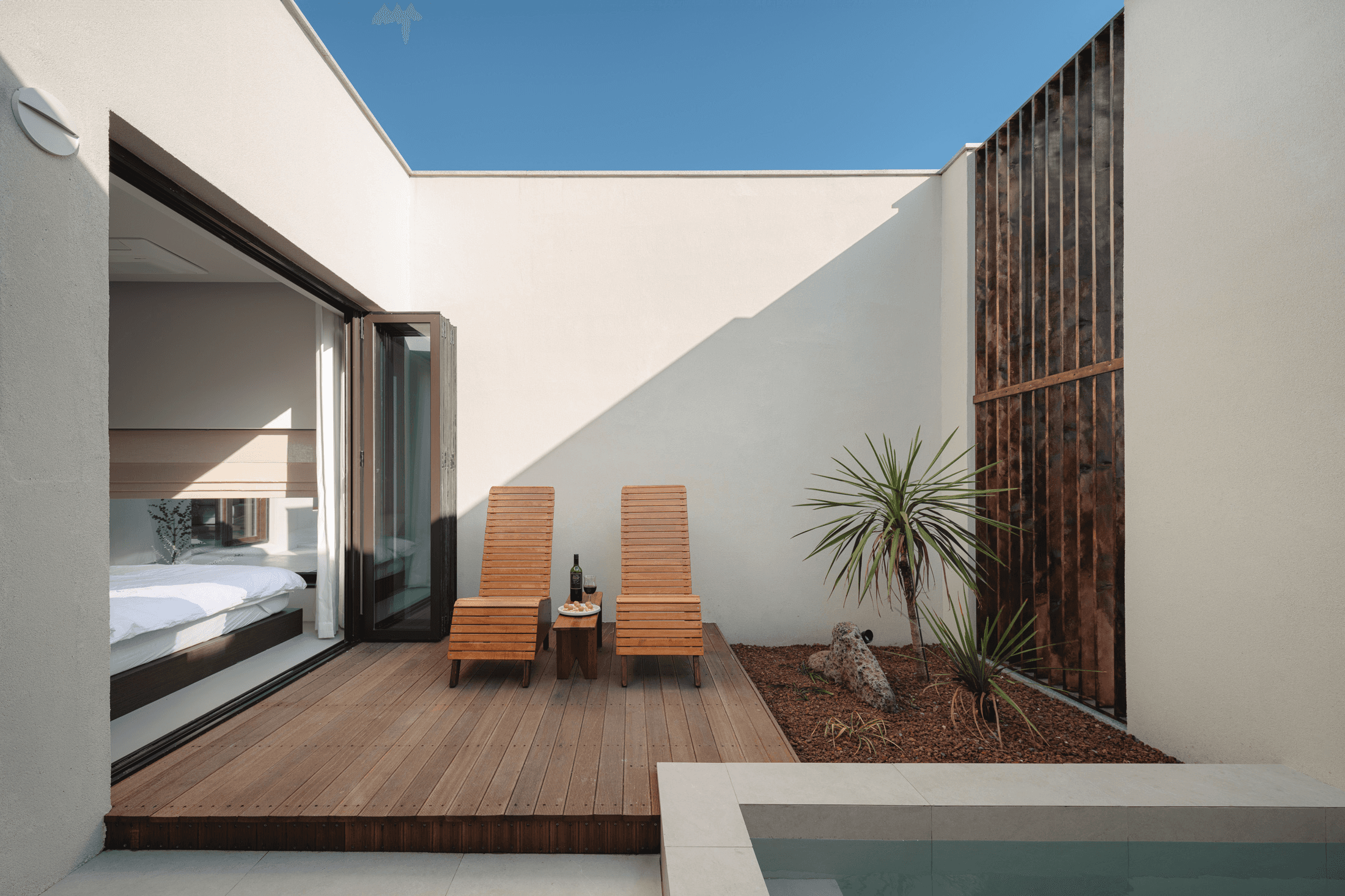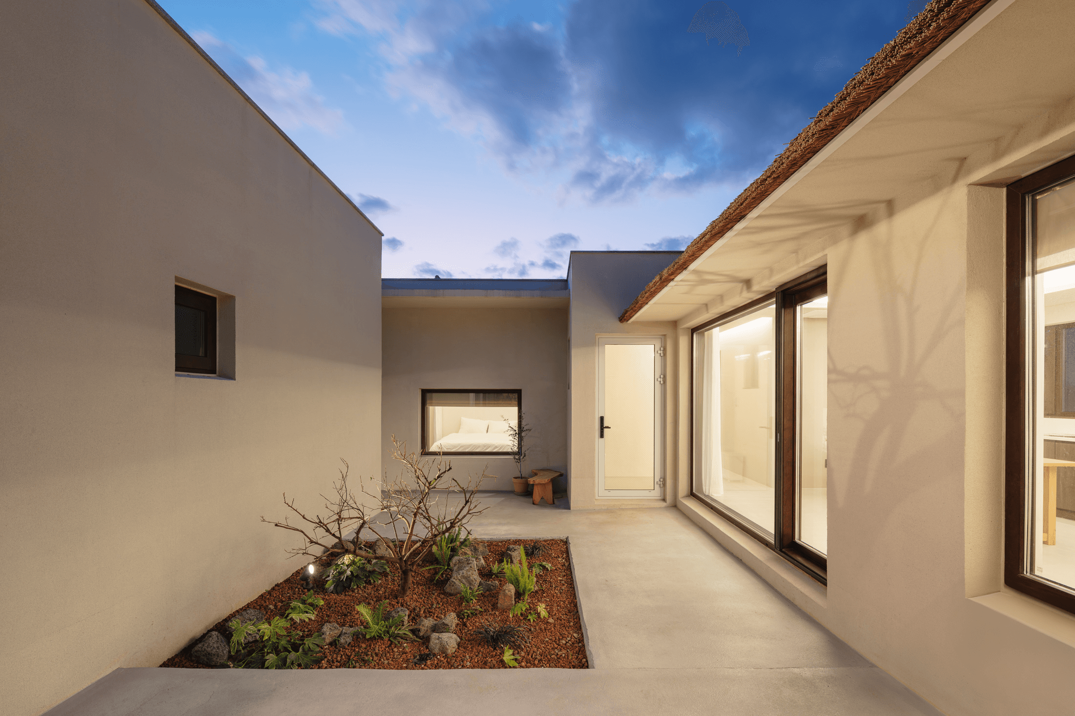‘속삭임의 순간’ 공간의 배치에 의해 자연스럽게 형성되는 자그마한 골목. 오묘한 정취와 제주의 푸른 바다. 그 속에서 우리는 사랑을 속삭이고, 휴식을 취하며, 낭만을 즐긴다. 아늑함 속에서 정신을 수양하고 땀을 흘리는 체험이 공존하는 또 다른 작은 세계를 만든다. 멀다면 멀고 가깝다면 가까운 그 몇 걸음 속에서 우리는 공간을 느끼고, 자연을 느낀다. 공간을 따라 발견하는 소소한 즐거움은 작은 공간이 커 보이는 역할을 한다. 공간과 공간 사이의 빈 공간이 만들어 내는 아늑함 속에서 각자 속삭임의 순간을 즐기는 하나의 작은 세상을 만들고자 한다. designed by B I : U M constructed by Y&K design photograph by haneol pics