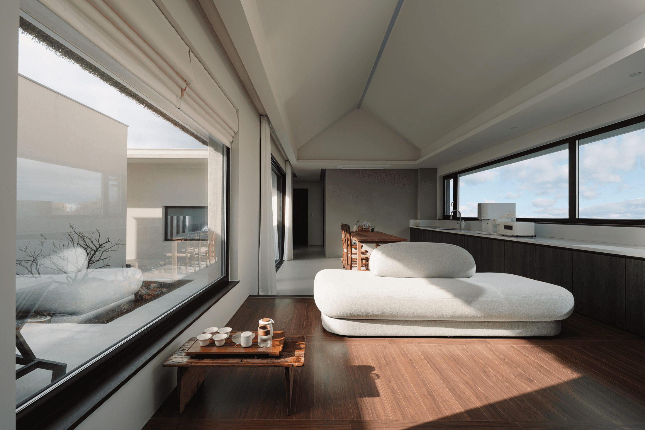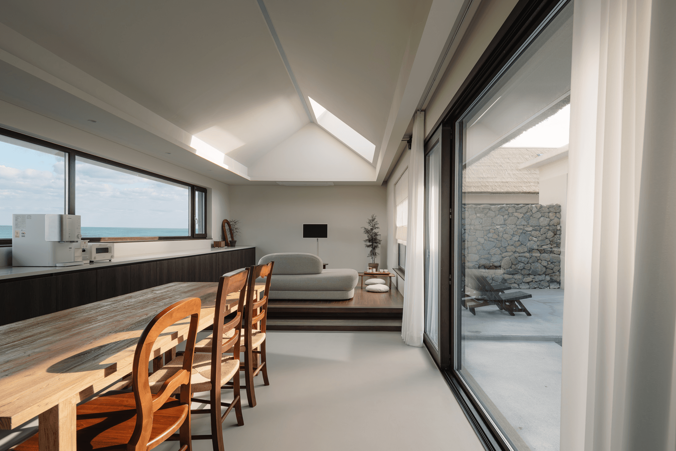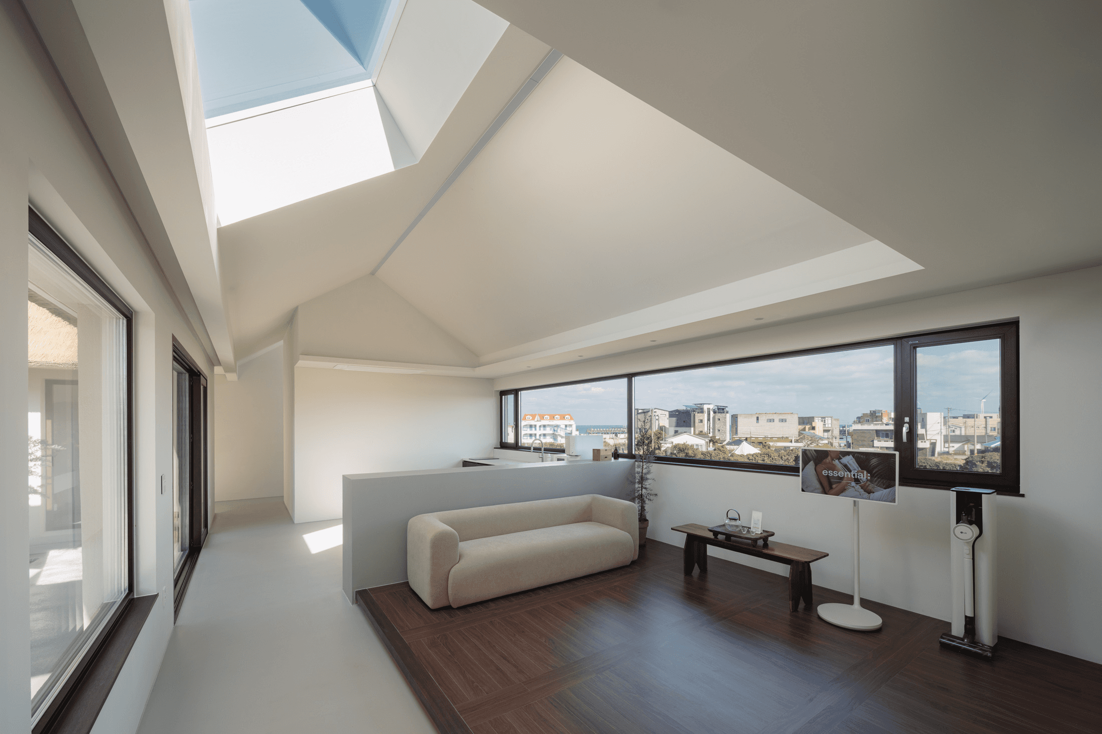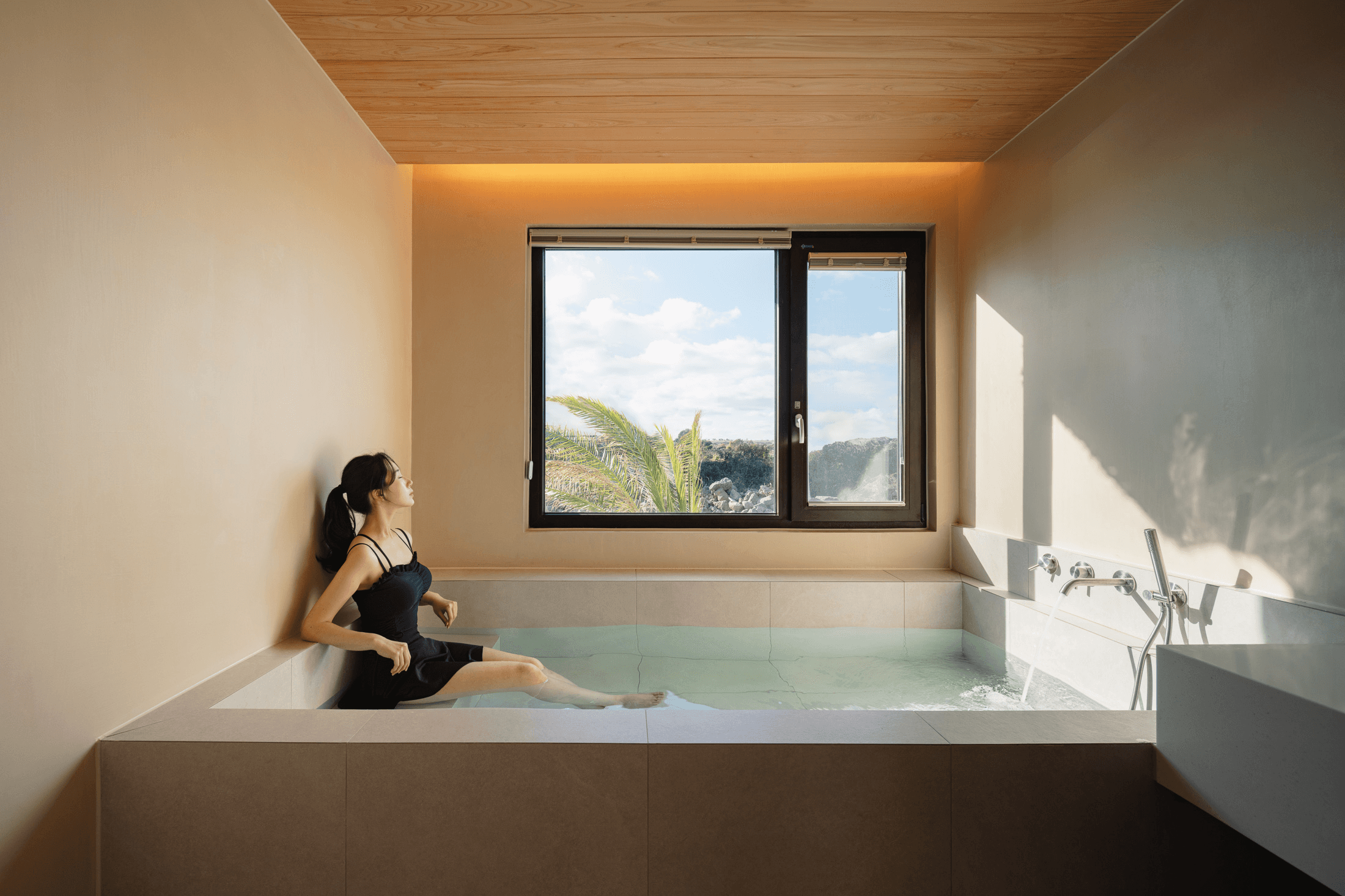 ‘속삭임의 순간’ 공간의 배치에 의해 자연스럽게 형성되는 자그마한 골목. 오묘한 정취와 제주의 푸른 바다. 그 속에서 우리는 사랑을 속삭이고, 휴식을 취하며, 낭만을 즐긴다. 아늑함 속에서 정신을 수양하고 땀을 흘리는 체험이 공존하는 또 다른 작은 세계를 만든다. 멀다면 멀고 가깝다면 가까운 그 몇 걸음 속에서 우리는 공간을 느끼고, 자연을 느낀다. 공간을 따라 발견하는 소소한 즐거움은 작은 공간이 커 보이는 역할을 한다. 공간과 공간 사이의 빈 공간이 만들어 내는 아늑함 속에서 각자 속삭임의 순간을 즐기는 하나의 작은 세상을 만들고자 한다. designed by B I : U M constructed by Y&K design photograph by haneol pics